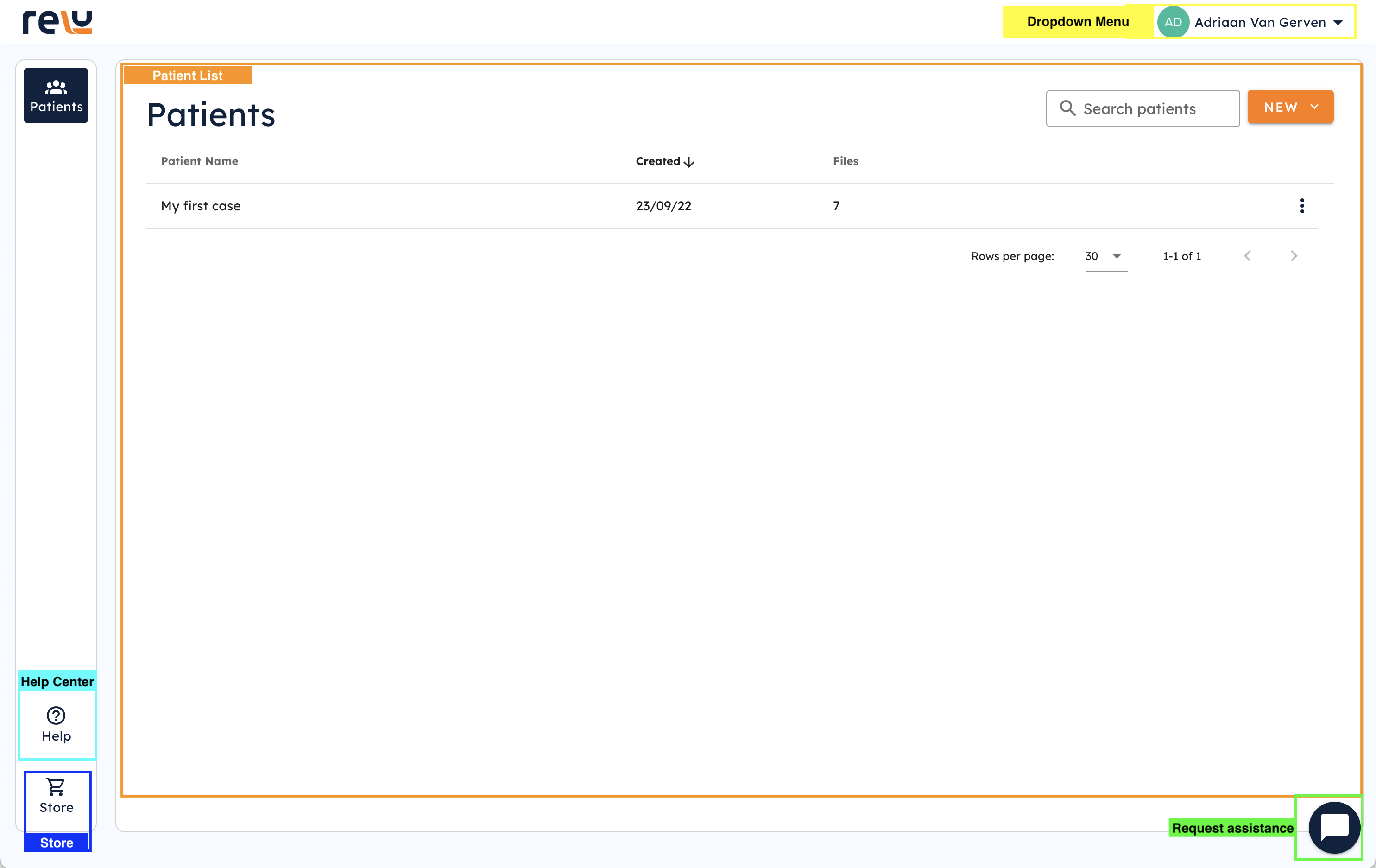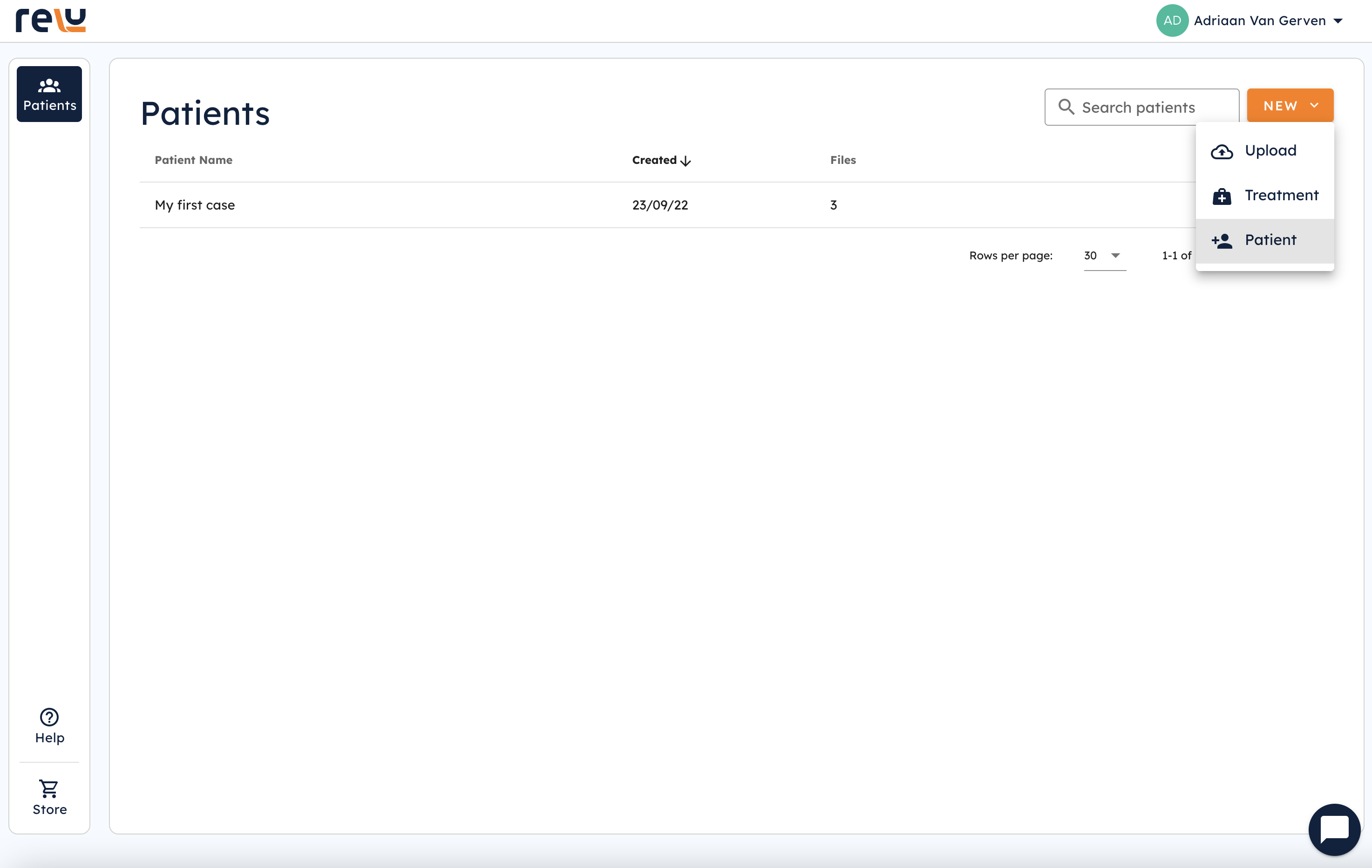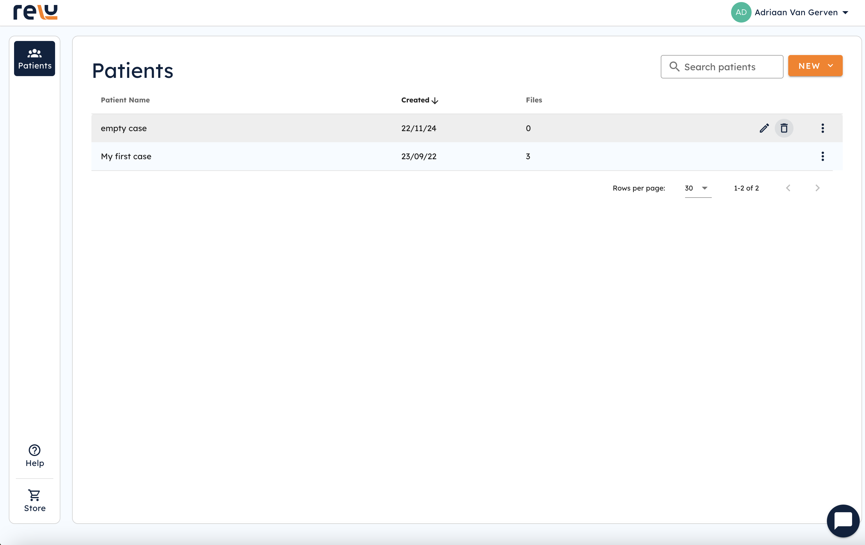 A new patient is created by clicking the “NEW” button in the top right corner of the patient list and selecting “Patient”. Next, choose a name for the Patient and click Create.
