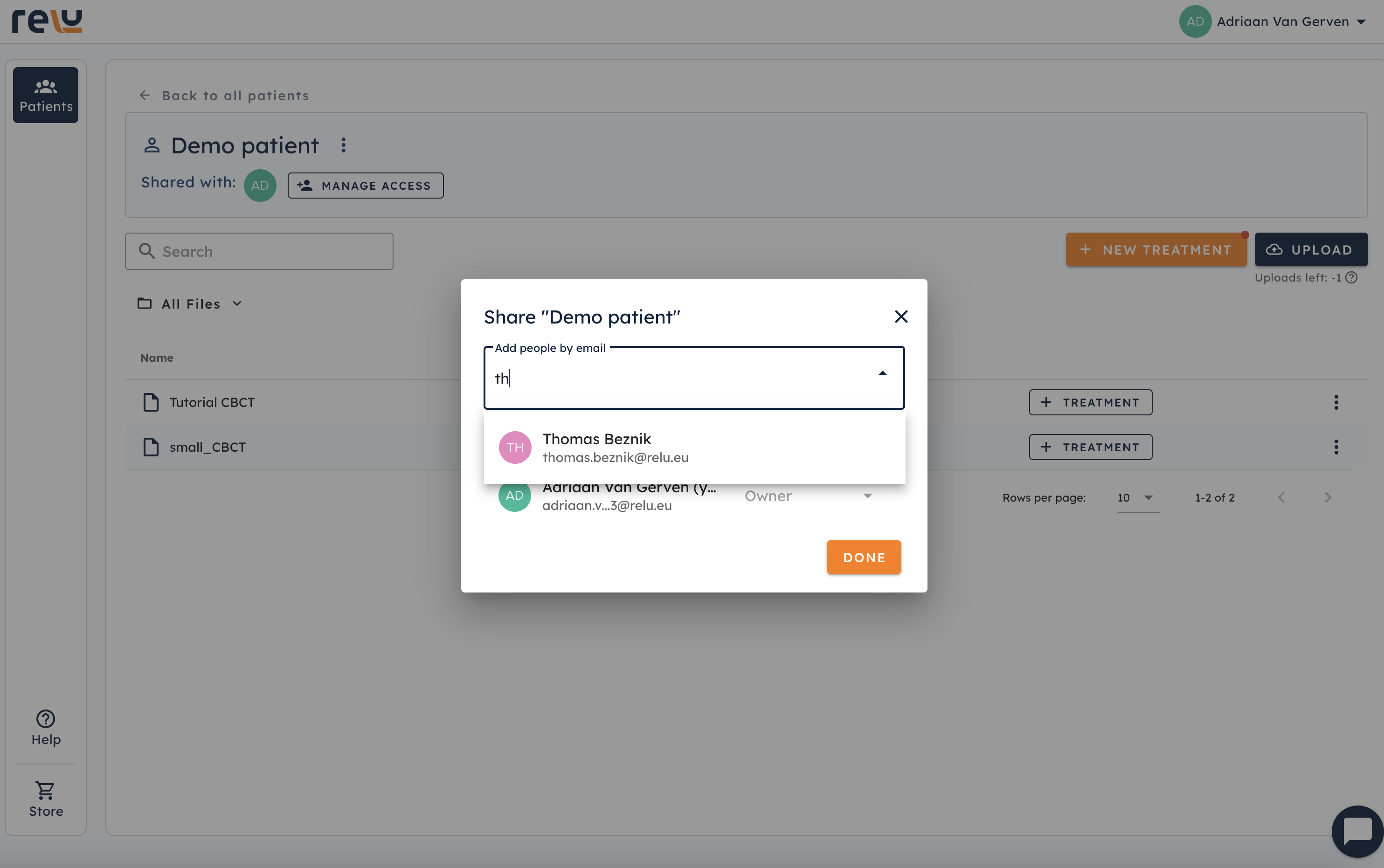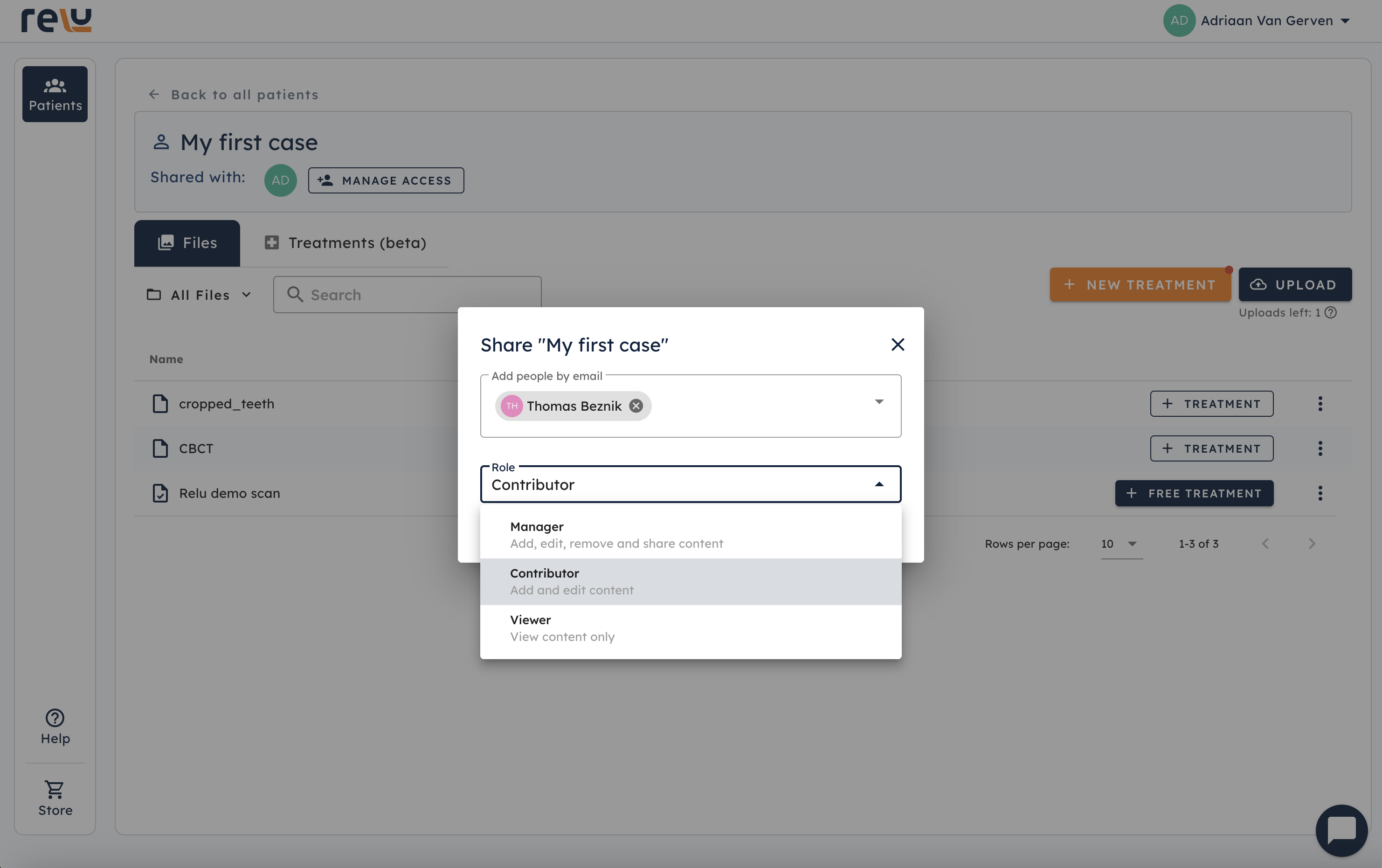 To share a patient with colleagues, clients or patients, you should invite them using the “Manage Access” button. Depending on the role you give them, this member will be able to solely view the file or add and edit files.