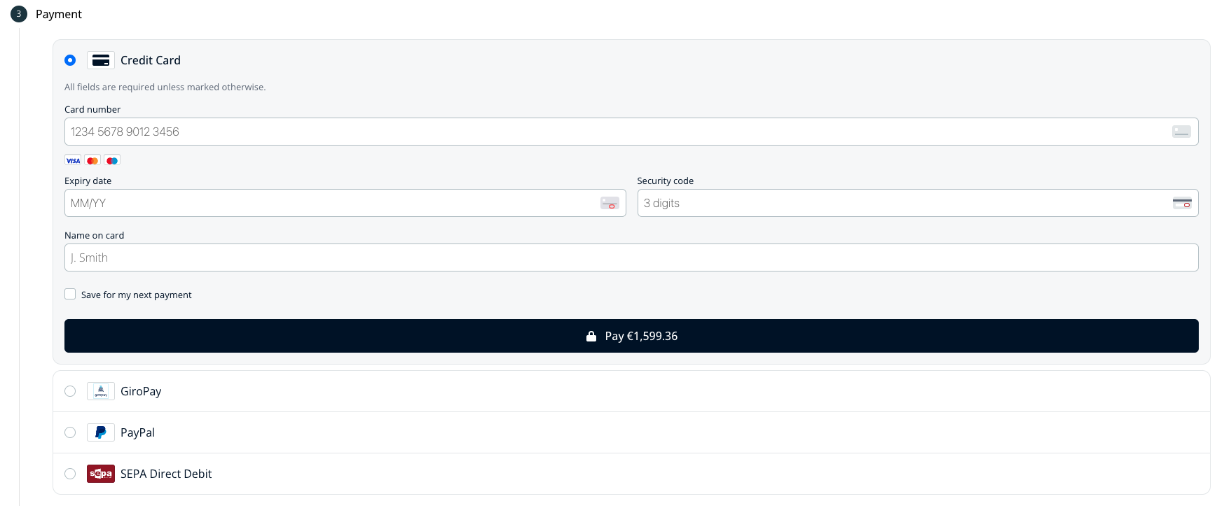 - Depending on the selected country in the previous step, different payment options will appear. Select the preferred option.