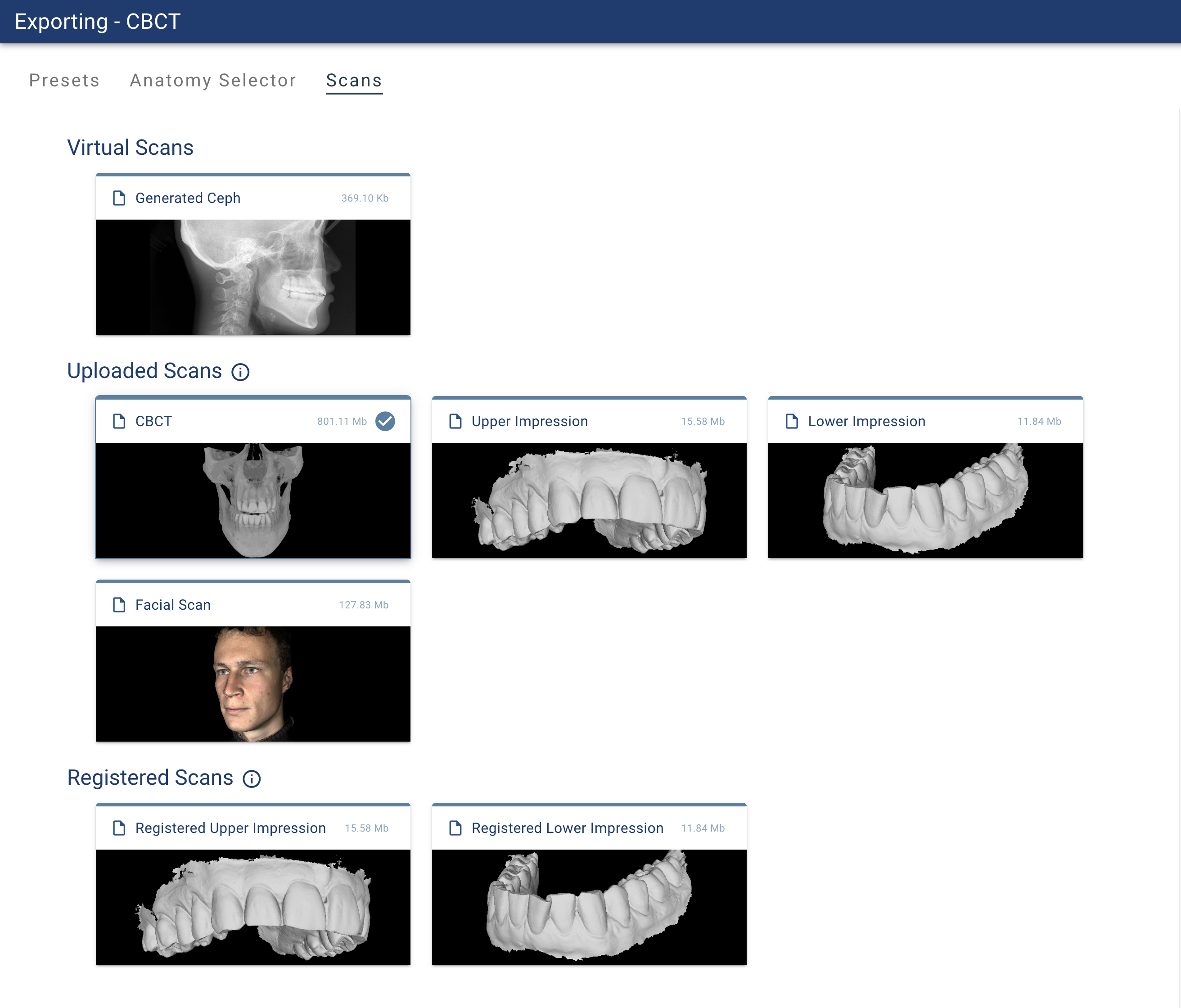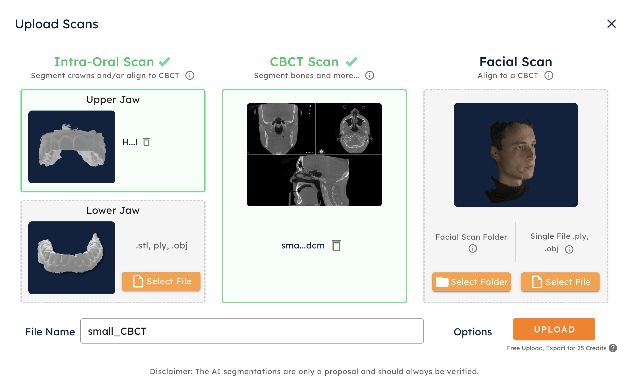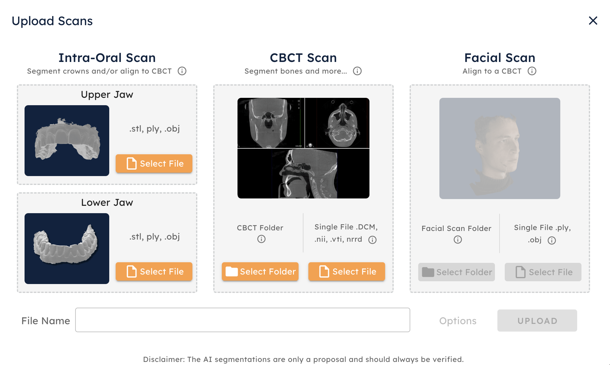 Disclaimer: Not each box should contain a file. You can select only a CBCT oronly an IOS. You can also upload multiple images at once to created Fused files. Facial scans require the user to also upload a DICOM.