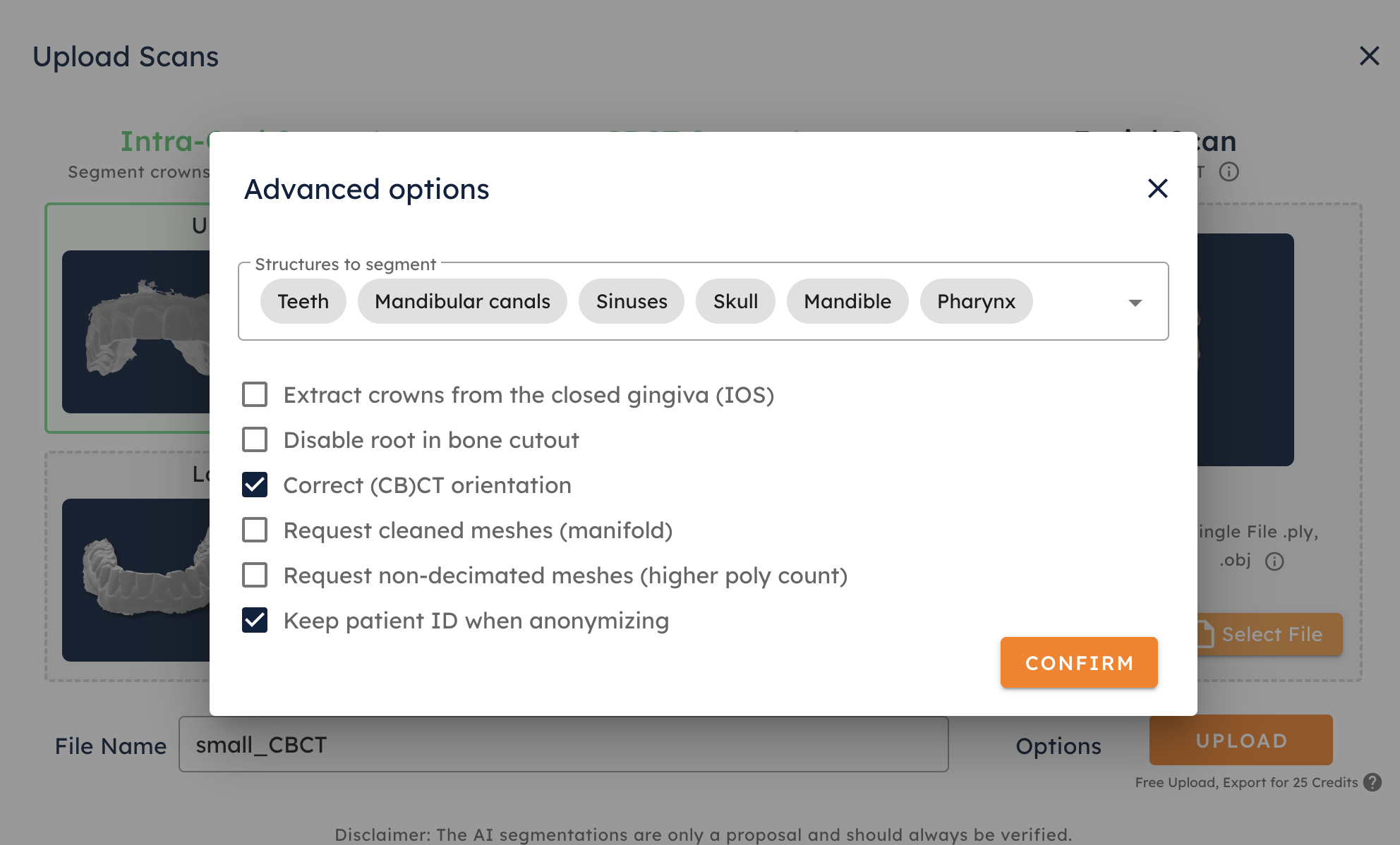 Choose a name for the Virtual Patient and click “UPLOAD”. Optionally click on Options and select the structures to segment in order to choose which parts of the CBCT will or will not be automatically segmented by the AI. .