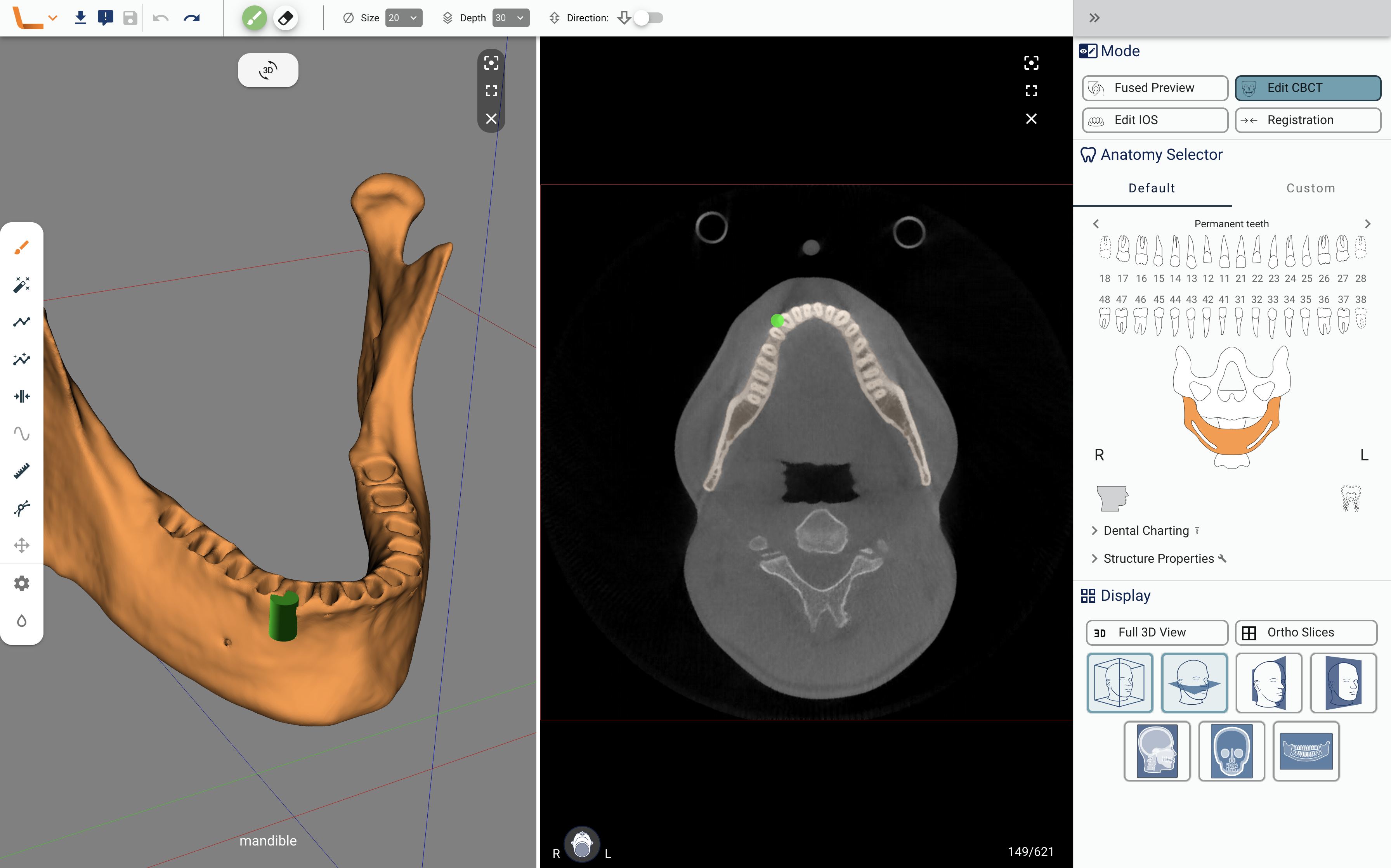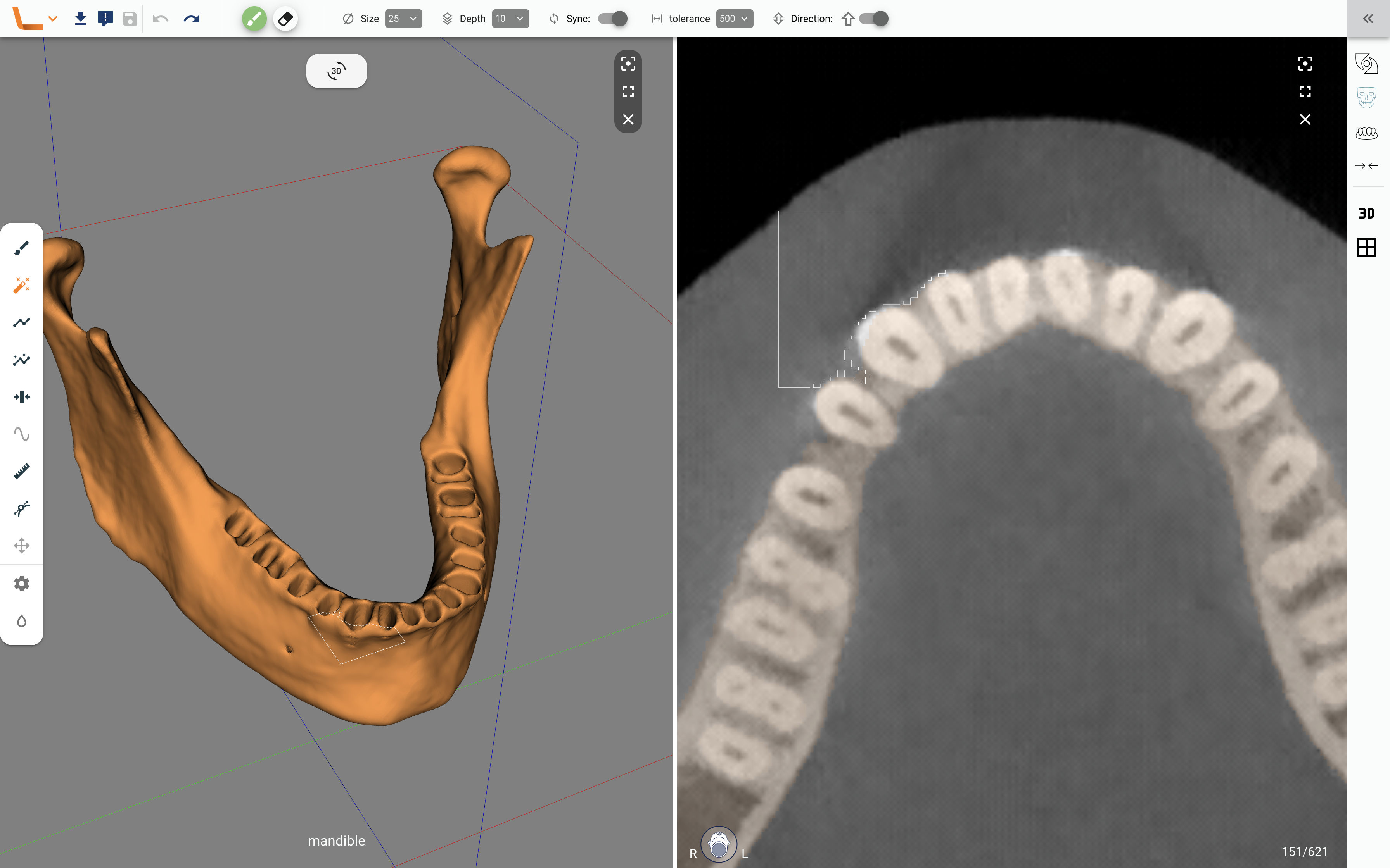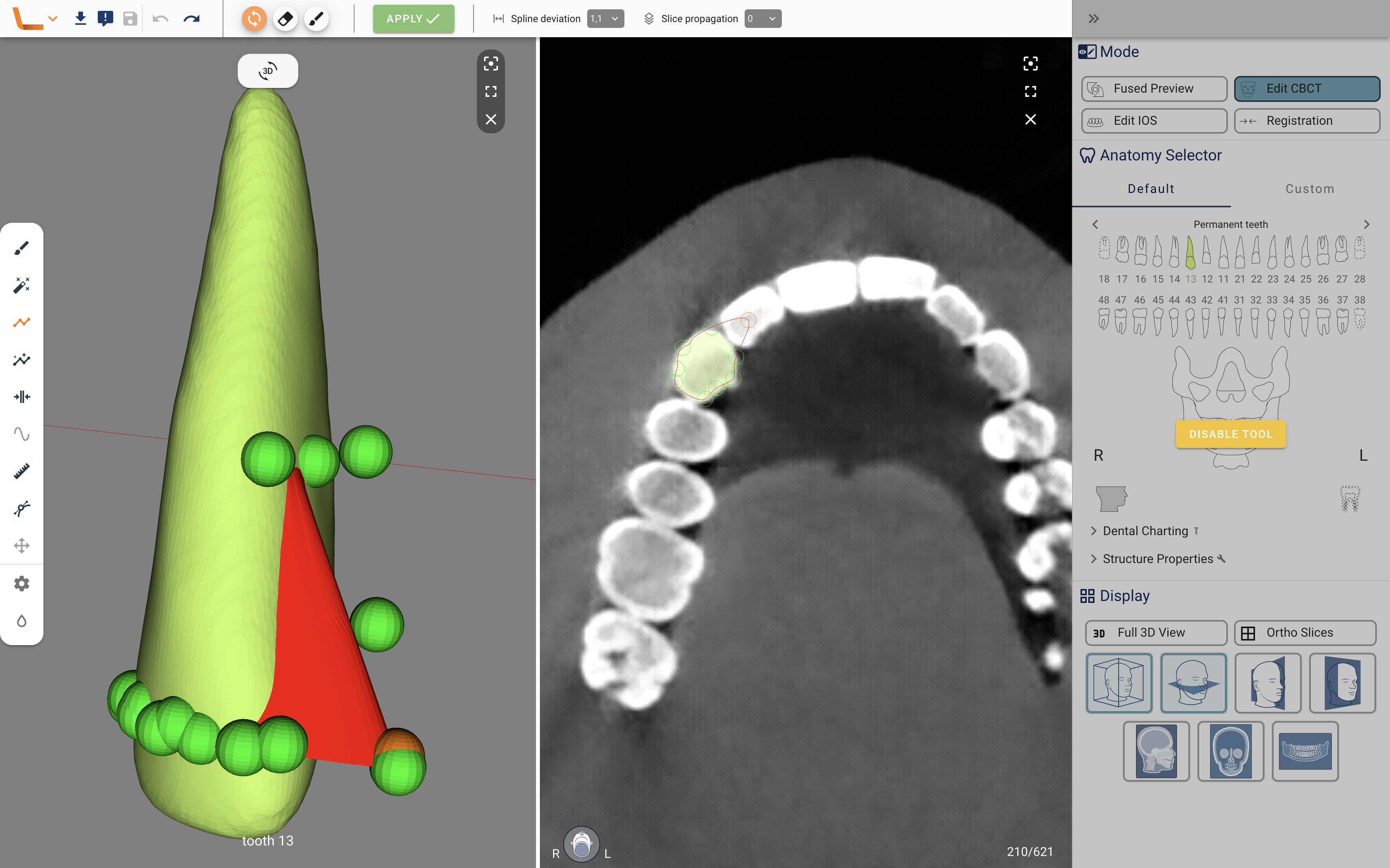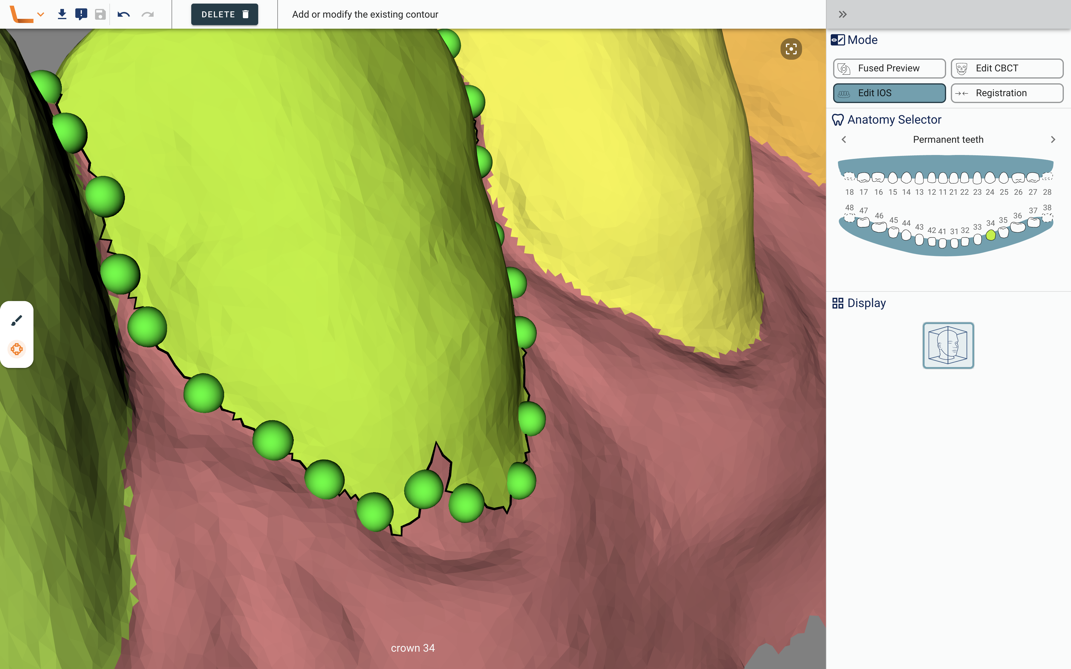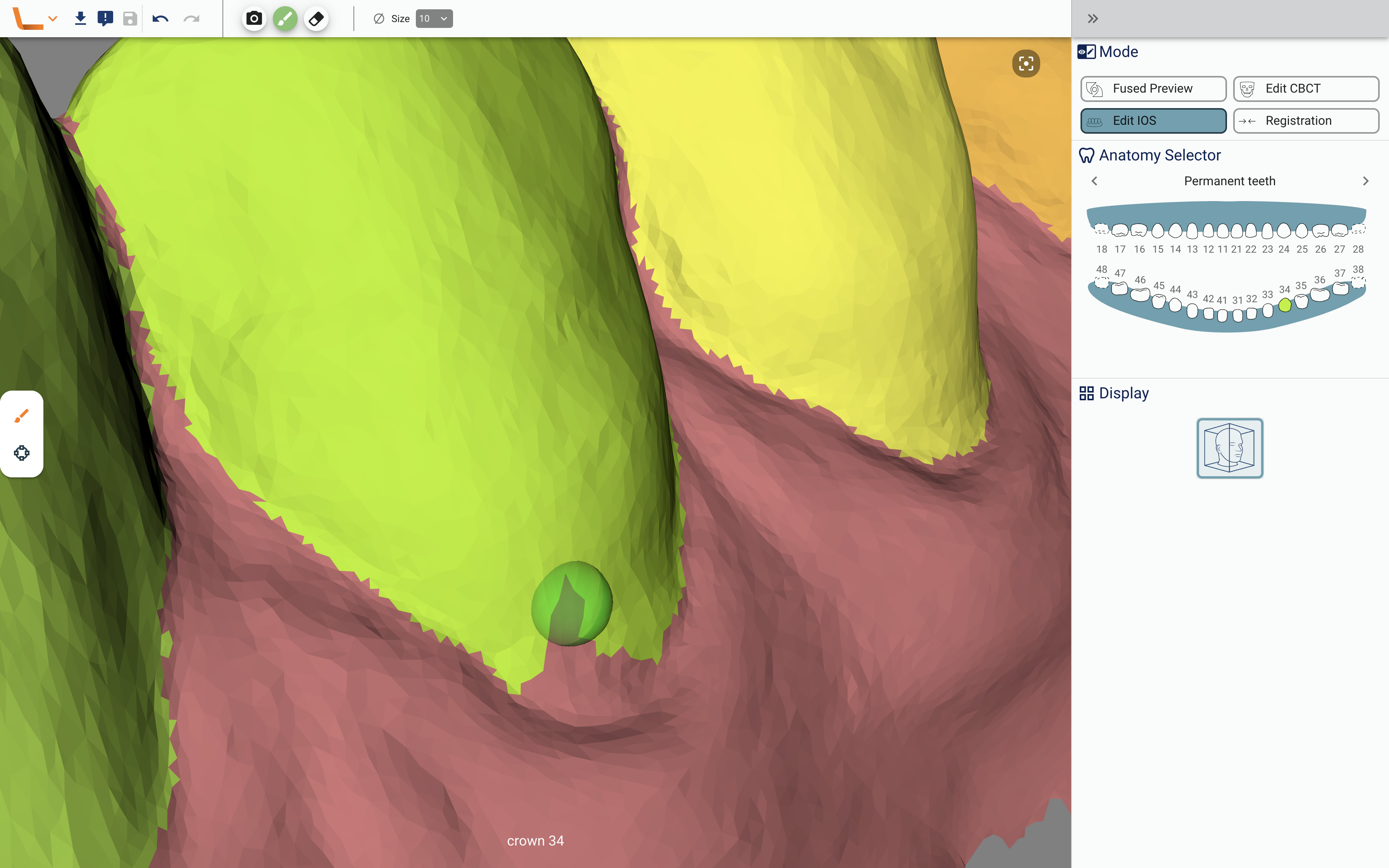 The 3D contour tool is often a fast way to change the crown segmentation by adding, moving or deleting spheres from the contour.