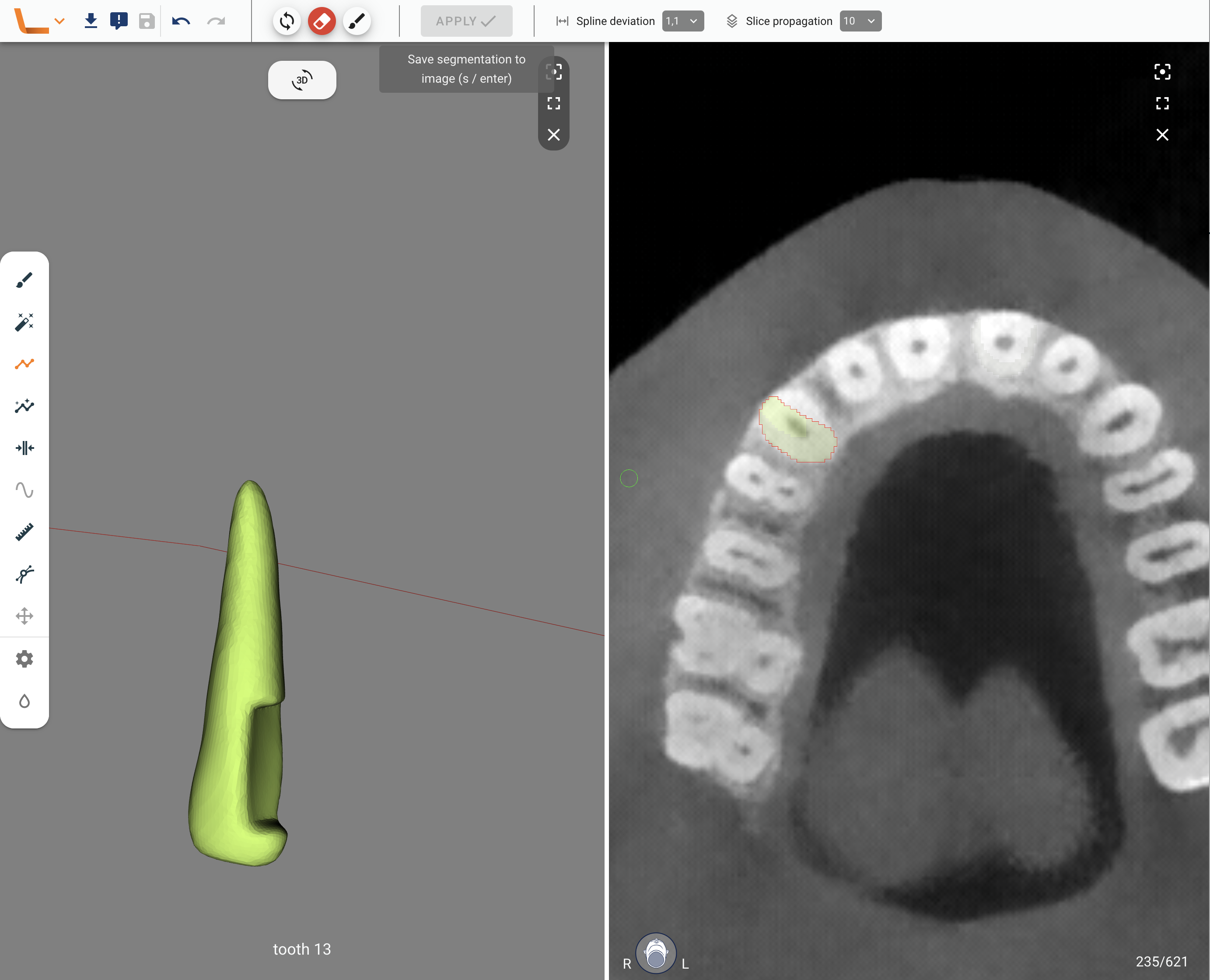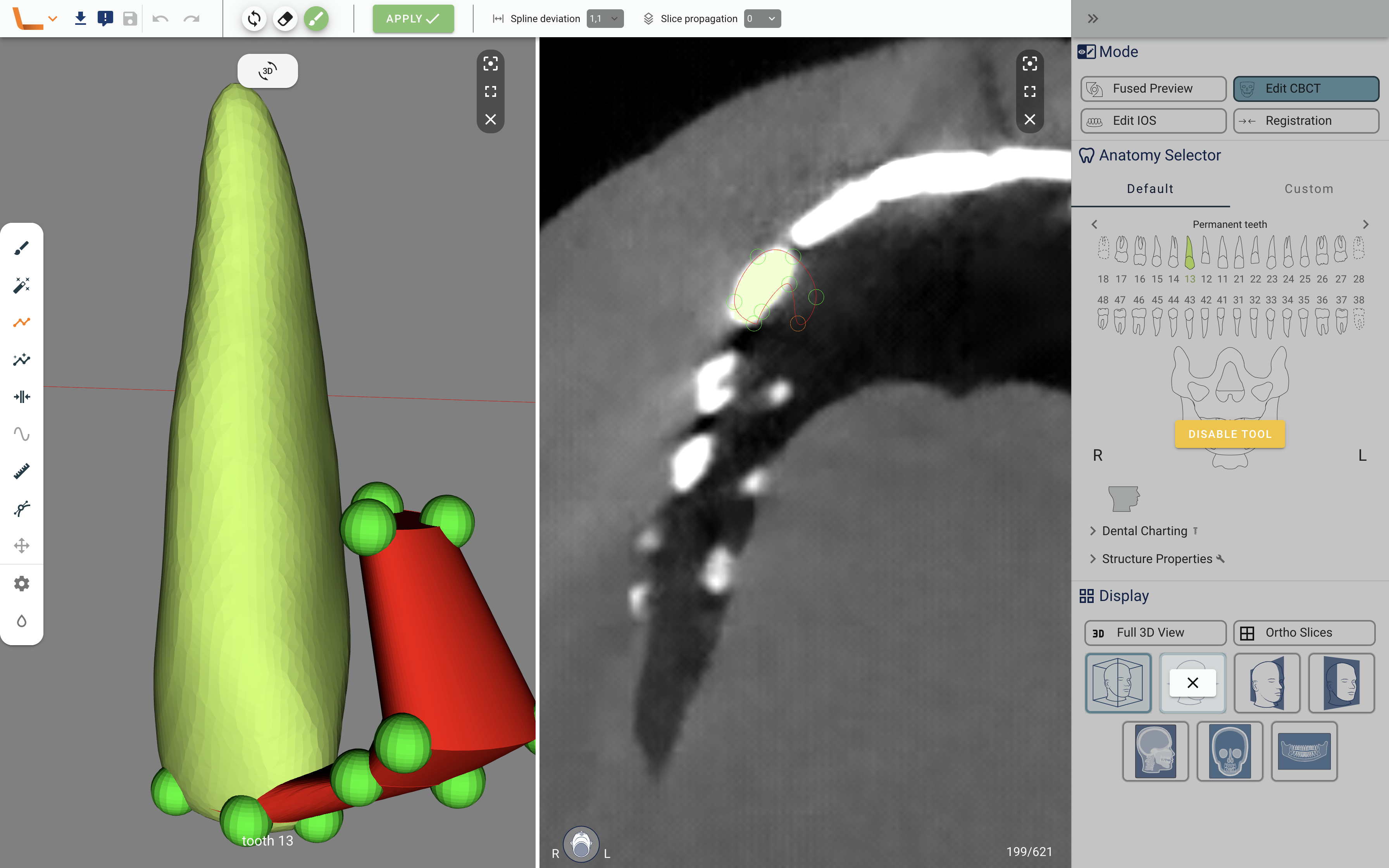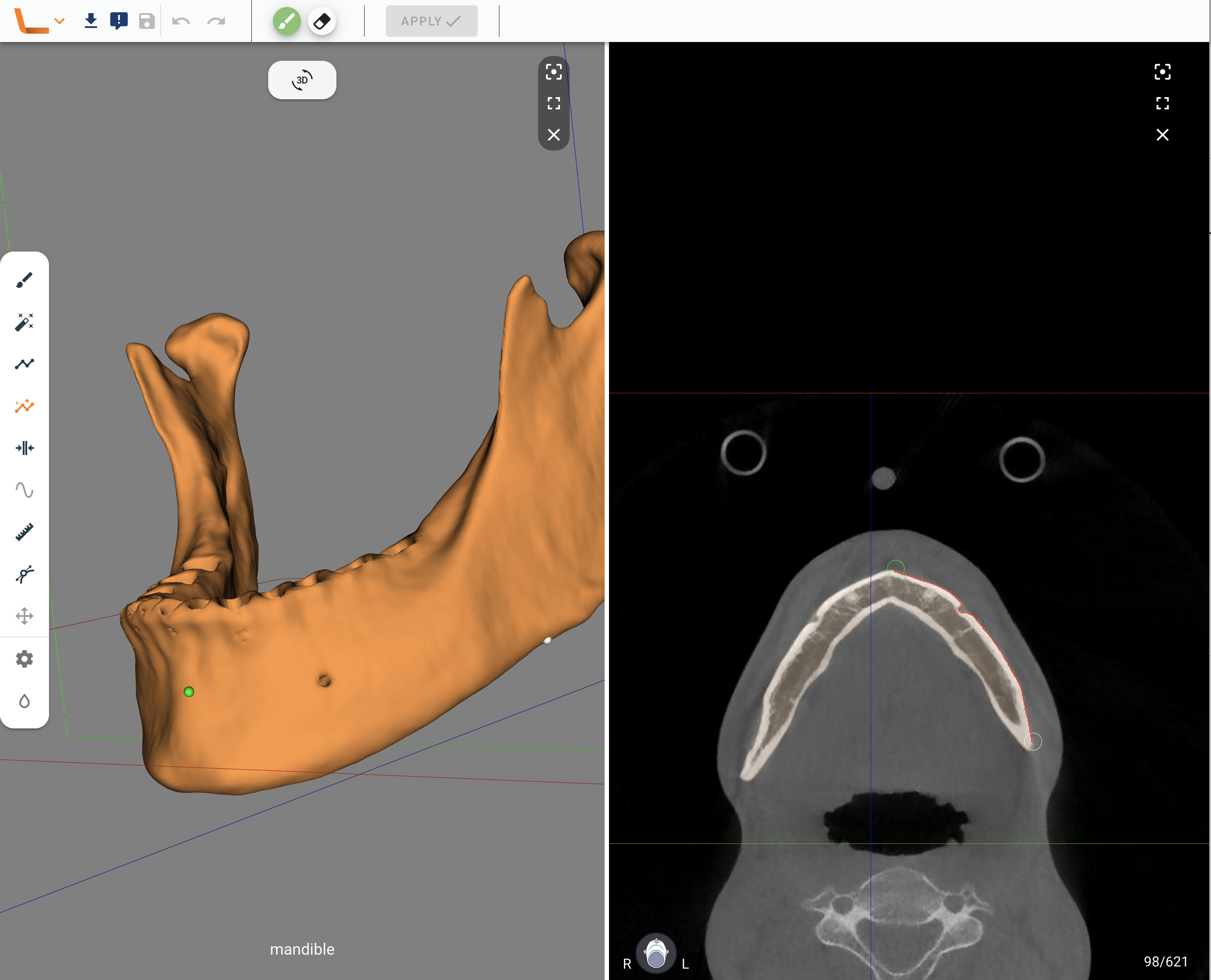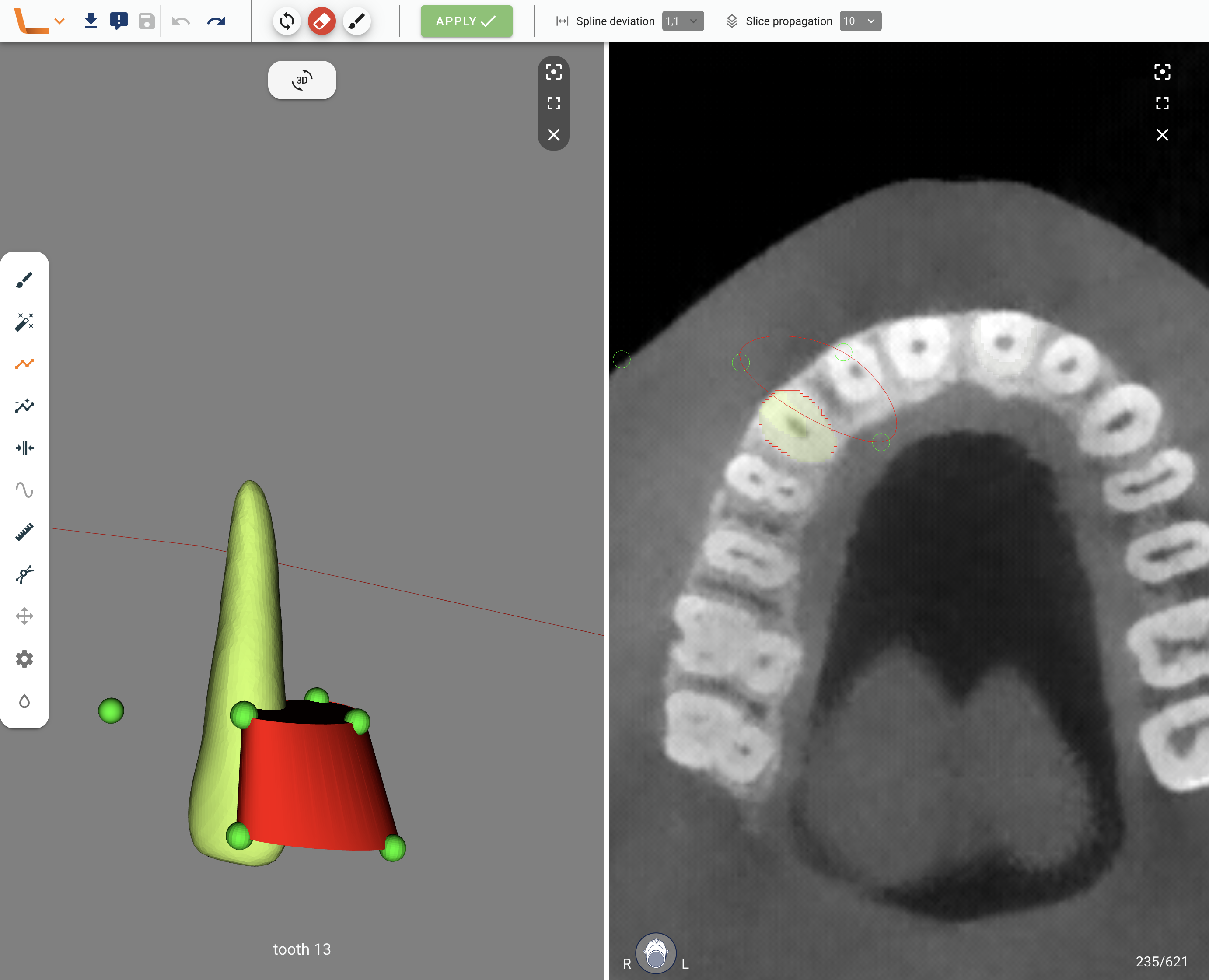 - Scroll through the slices and verify if the yellow line corresponds nicely with the surface of the crowns on the CBCT