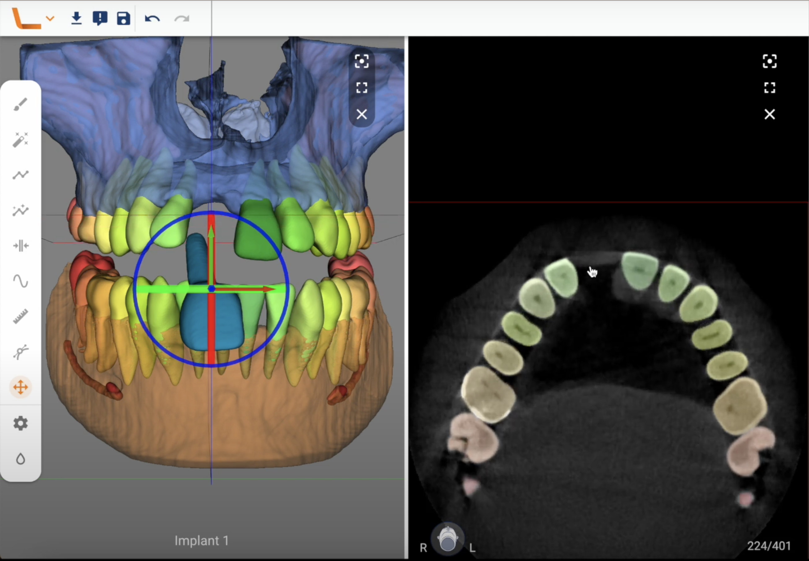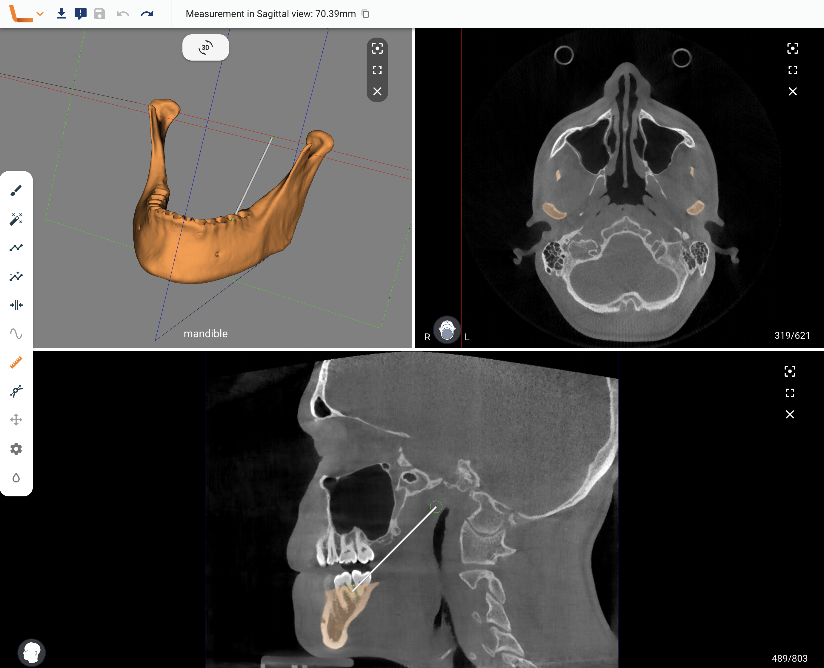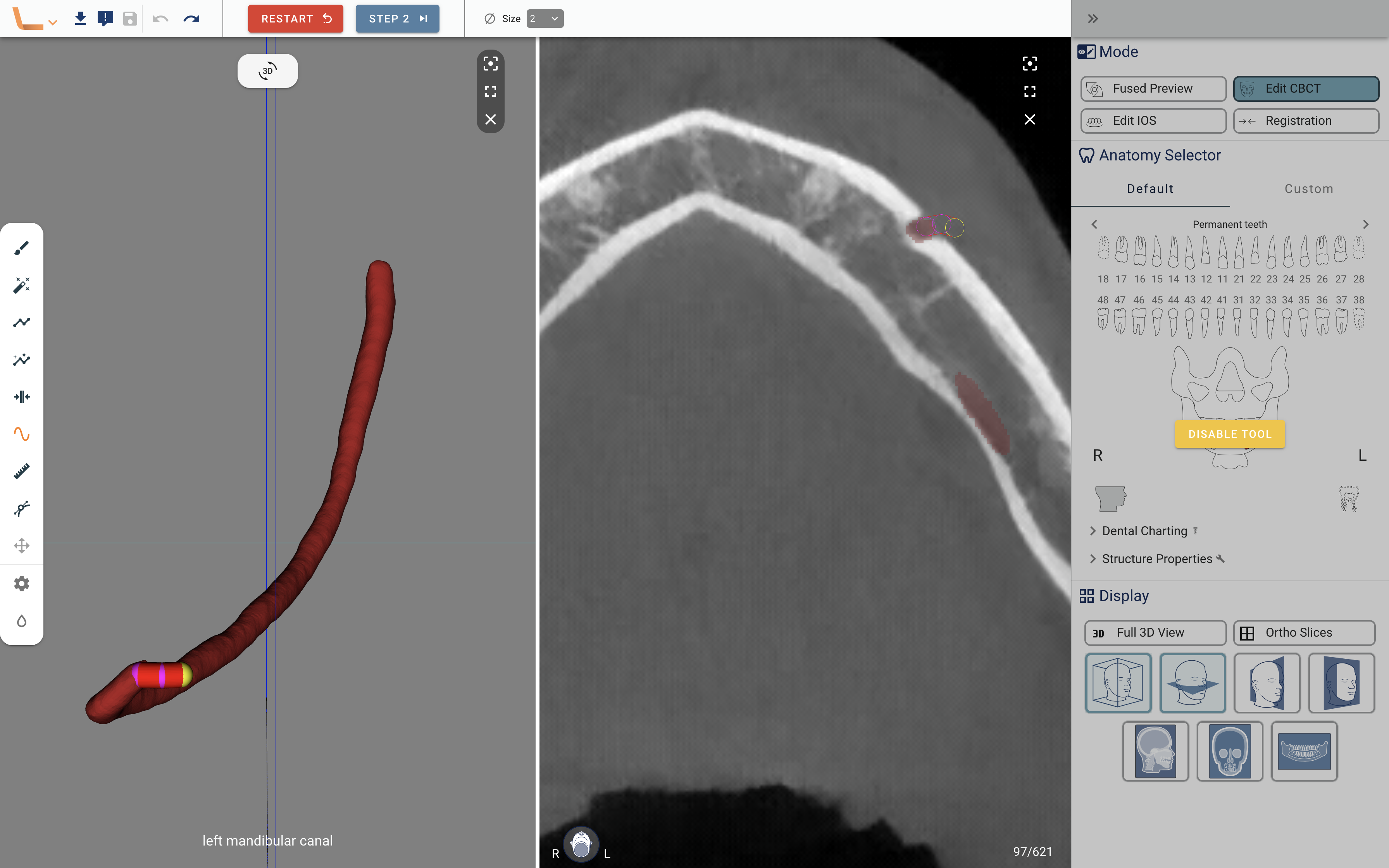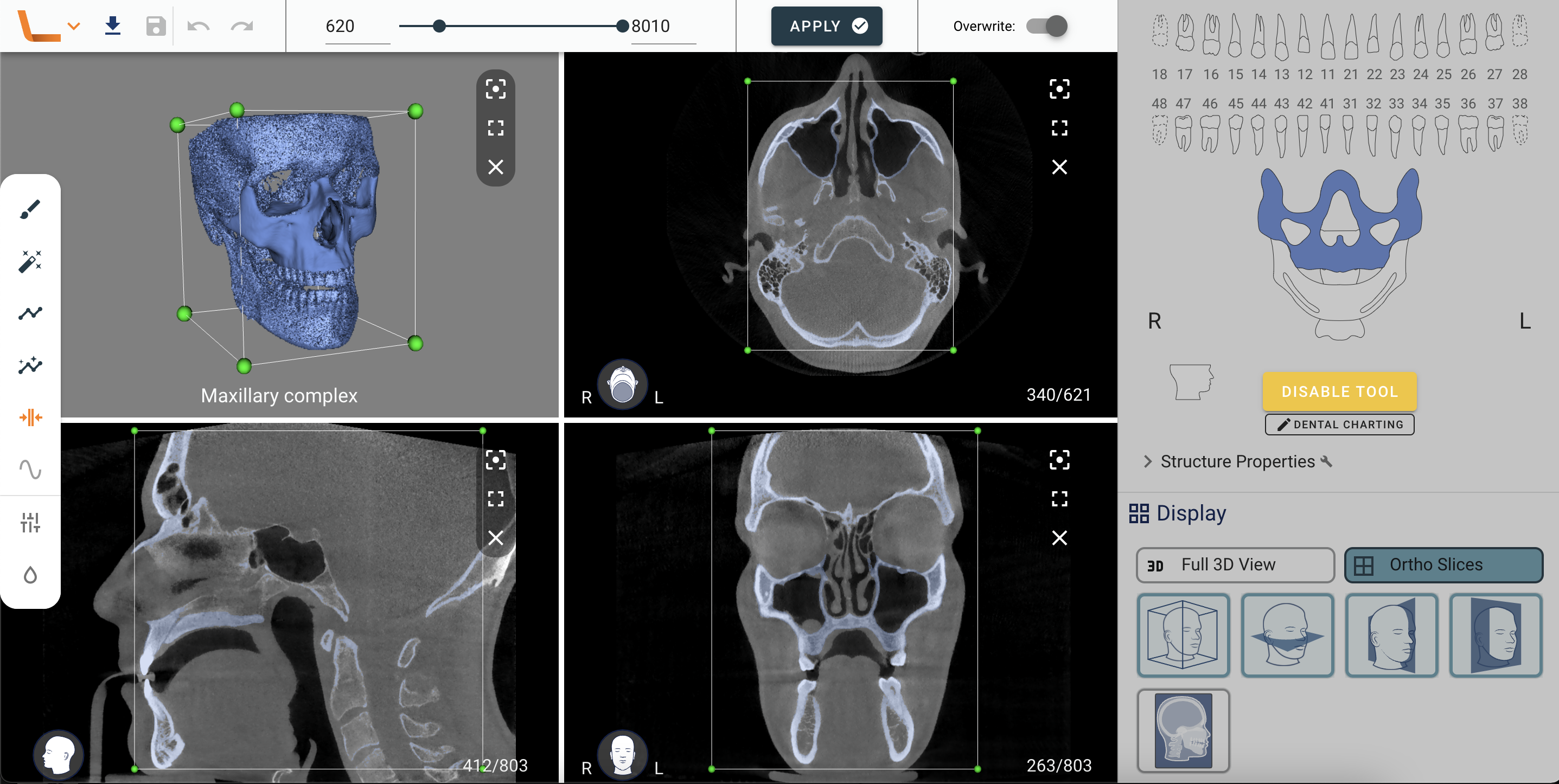 - Scroll through the slices and verify if the yellow line corresponds nicely with the surface of the crowns on the CBCT