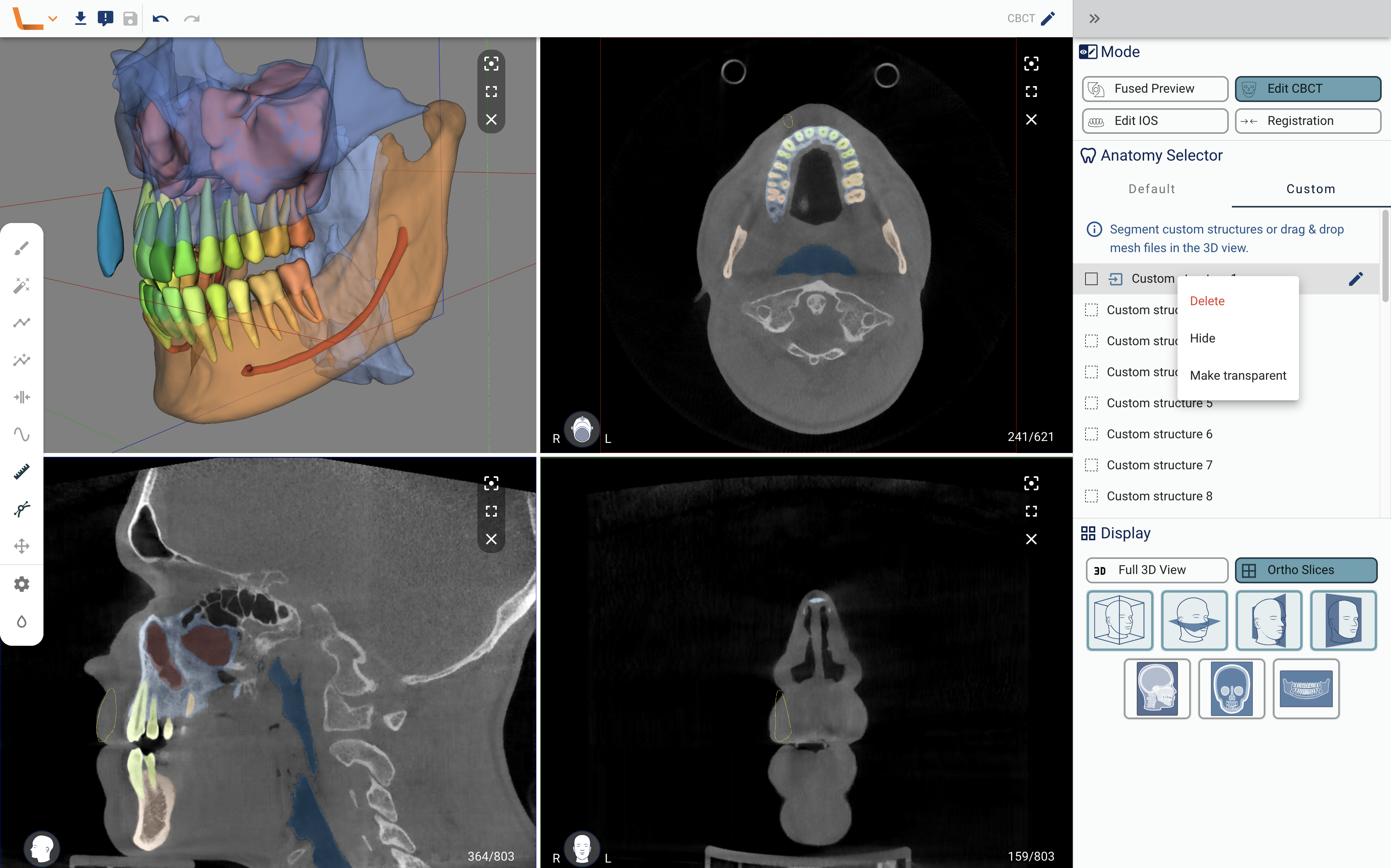 After you have added the structure, its outlines are visible in the ortho slices and it is listed in the “Custom“ Tab in the anatomy selector. Right click the structure to delete, hide or make it transparent.