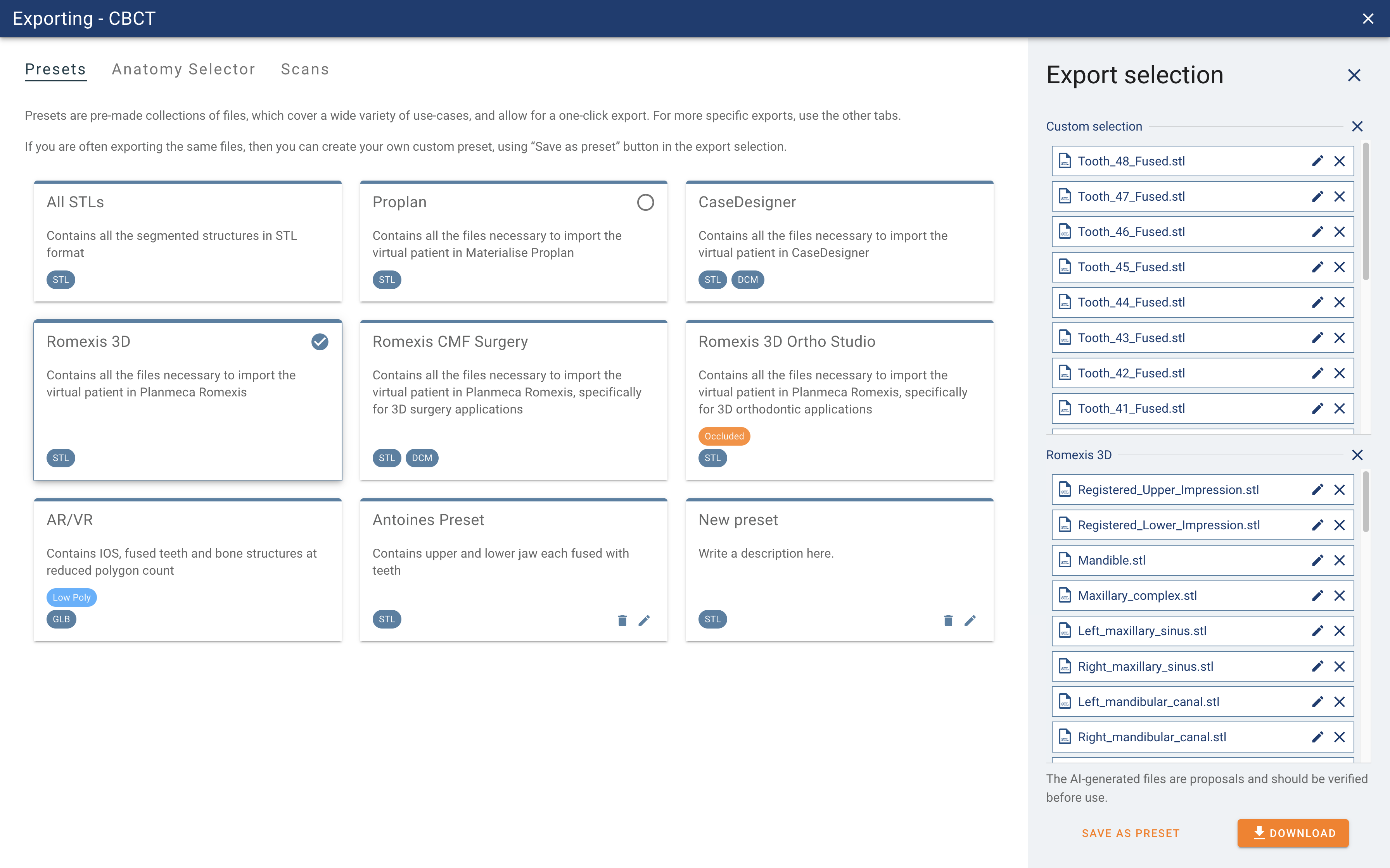 Once you are happy with the segmentation and registration results and have activated the file, the resulting models can be exported in the following formats: