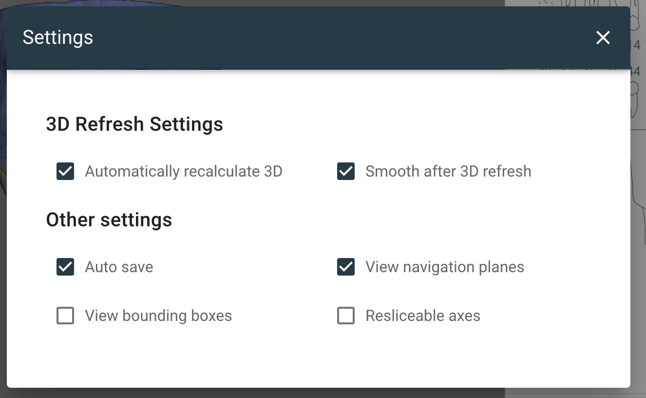 - View navigation planes: This allows for turning off the planes that are shown on the 3D model that indicate the position of the axial, sagittal and coronal views.