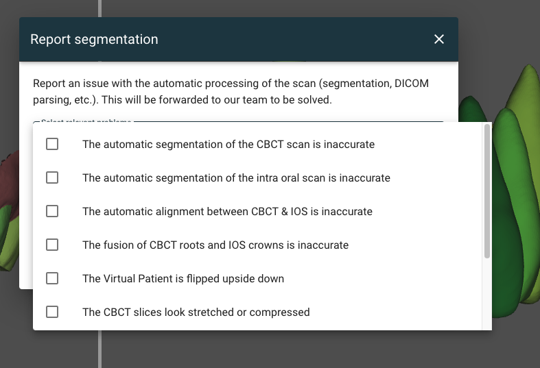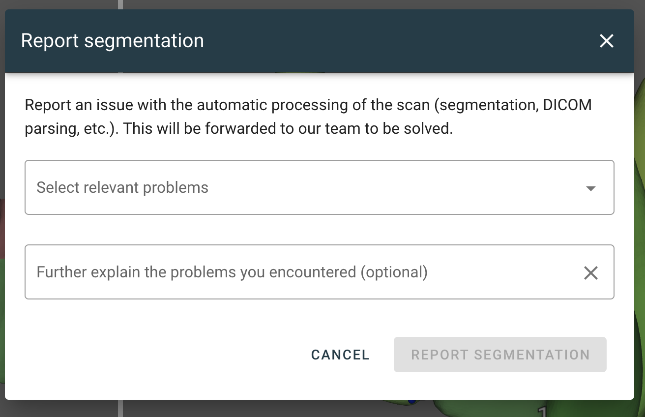 To narrow down the problem you have encountered with your segmentation, select one or multiple of the relevant options from the drop down menu. Optionally, further explain the problem.