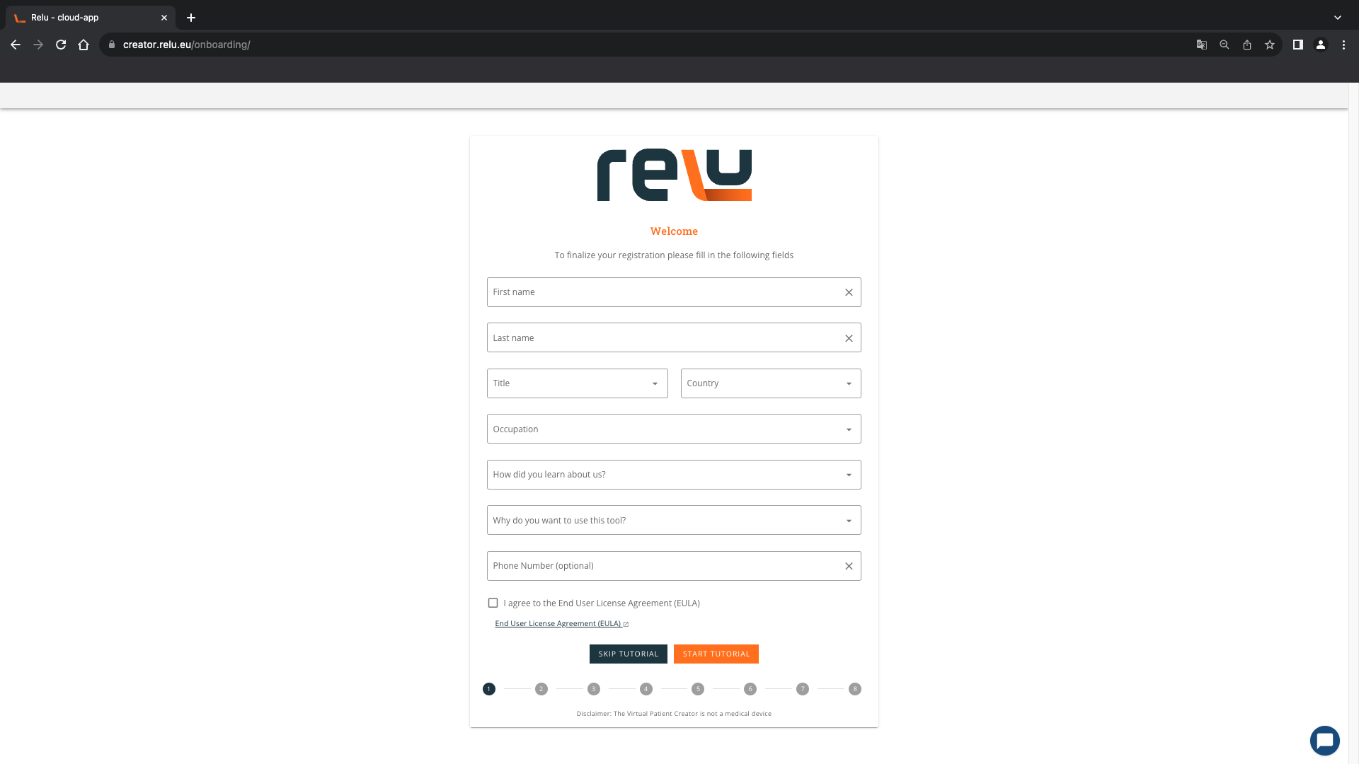 Finally check the box “I agree to the End User License Agreement (EULA)” in order to finalise your account set up. You now have the option to skip or follow a short tutorial on the Relu® Creator.